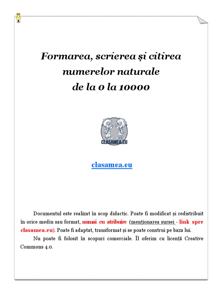 Formarea Numerelor Naturale Source from : https://www.mathema.ro/algebra/formarea-numerelor-naturale Scrierea numerelor în baza zece este o scriere poziţională. Cand scriem un numar cifrele se acest mod de scriere a unui numar natural se numeste scrierea in baza zece sau scrierea in sistem zecimal. Fișe de lucru pentru scrierea și citirea numerelor scrise cu cifre romane, exemple de jocuri și materialele necesare. Scrierea şi citirea numerelor naturale. Adunarea și scăderea numerelor naturale până la 10000, fără trecere peste ordin.
